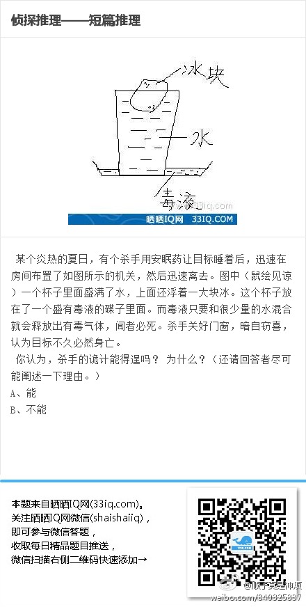 答案:能。有些人可能只会想到浮冰融化后水不会溢出来,而认为计谋不能得逞,但还应考虑到冰熔化吸热,空气中的水蒸气会液化在杯子外壁,从而使毒液接触到水,这个诡计是可以得逞的。