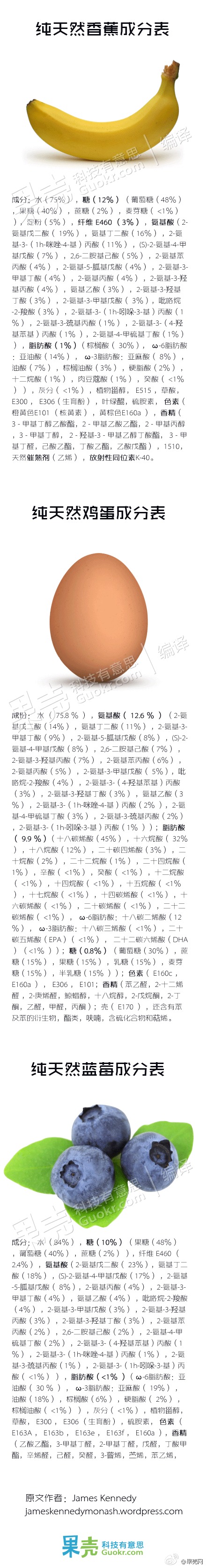 澳洲有个叫James Kenndey的老外受够了那些嚷嚷“纯天然”(All-natural)如何如何的人,决定把几个纯天然食品的成分表开列出来。结果……就是下图这个样子!