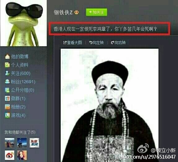 你说你想多当几年英国人就算了,李鸿章碍你啥事了?人家1840年还在读书,签条约关他啥事?这我也忍了,可你还放个曾国藩的照片。。。