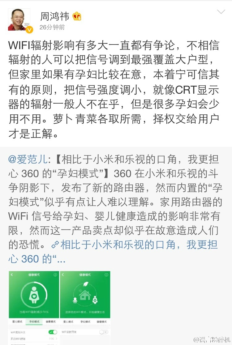 【针对孕妇的路由器?煽动恐慌,制造需求】最近,360推出了针对孕妇的可降低信号强度的路由器。包括Wi-Fi信号,生活中能遇到的辐射绝大部分都是低强度的电磁辐射,对人体健康没有影响,在学界早有定论。这种路由器的推出,是通过传播谣言、煽动恐慌硬生生来制造需求: