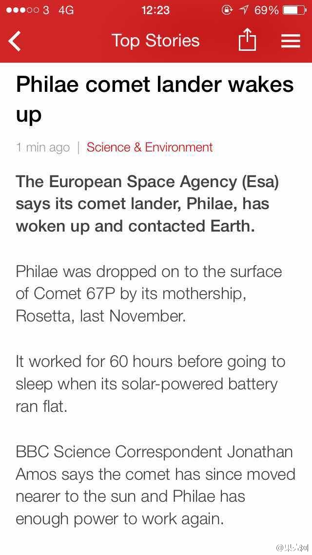 :我了个大擦!推上炸锅了!绝对是今天最好的消息!ESA的工程人员说菲莱的电池现在有24瓦电力,这足以完成许多项科学实验。