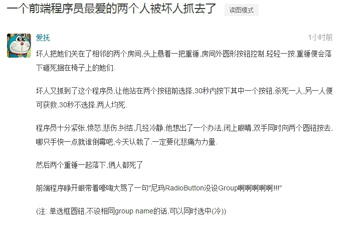 【程序猿冷笑话向】一个前端程序员最爱的两个人被坏人抓去了,坏人把她们关在了相邻的两个房间,头上悬着一把重锤,房间外圆形按钮控制,轻轻一按,重锤便会落下砸死捆在椅子上的她们…… via 果壳网友 爱抚