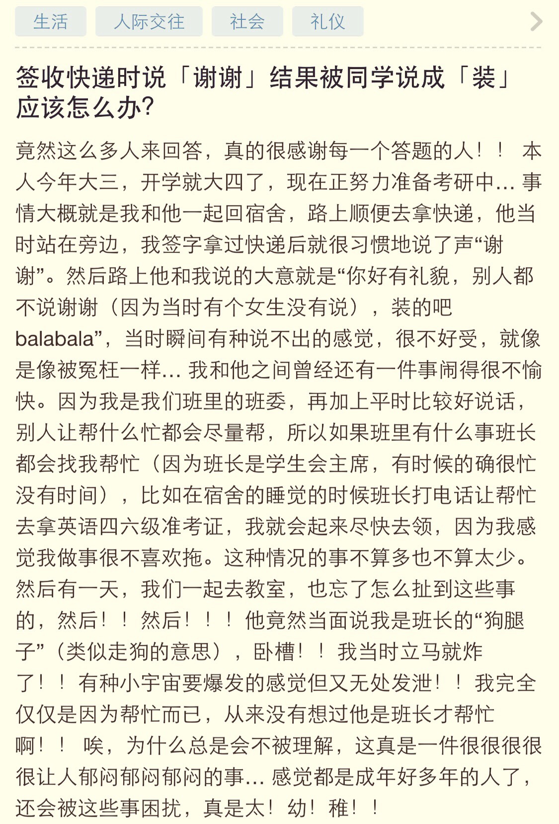 【签快递后对小哥说“谢谢”,结果被同学说是“装”】第一张图是问题描述,分类有“人际交往”及“礼仪”。我看到好多答案引申到各种说谢谢的方面,有些小感动,选了几张放出来。是这样啊,大多是90后很突出的一个优点就是懂礼貌。