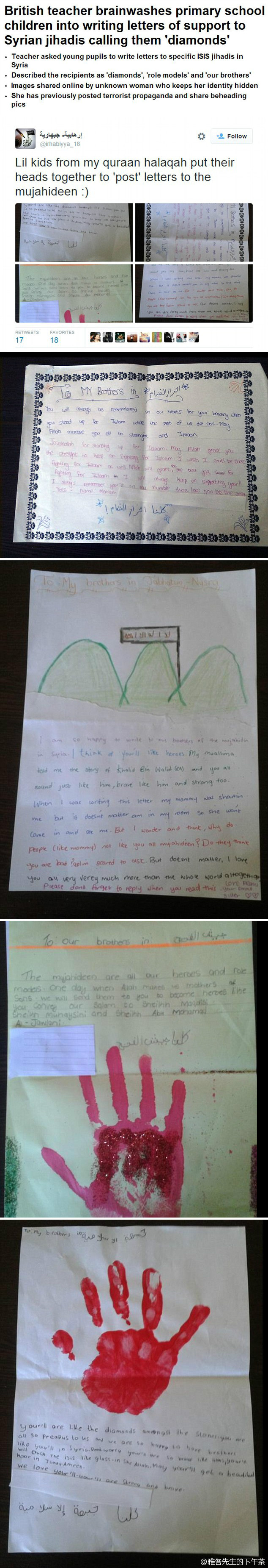 别怪英国政府不愿意接收难民了,他们自己的事都头疼不完。最近一个英国穆斯林女教师在推特上Po出自己教孩子们写给叙利亚圣战分子的信,信件用英语和阿拉伯语两种语言写成,开头称他们为“兄弟”并在信中称赞对方为珍宝和人生楷模,其中一张信纸上还有孩子用蜡笔画下的飘扬在山间的ISIS旗帜