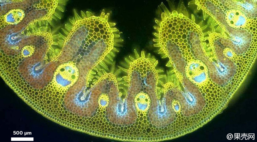 :滨草叶片横切面的显微结构,用到了黄色和蓝色染料,笑脸是维管束: