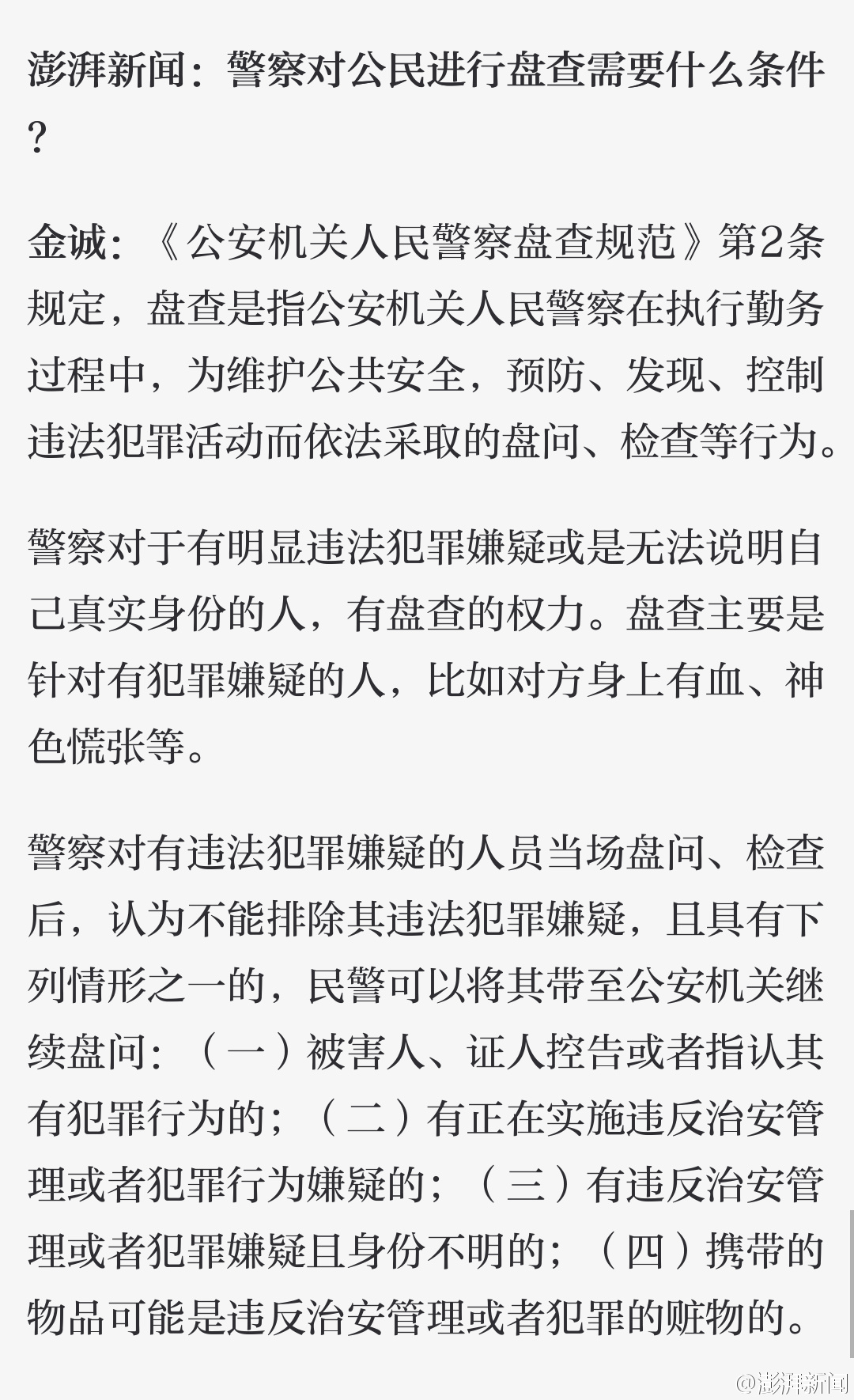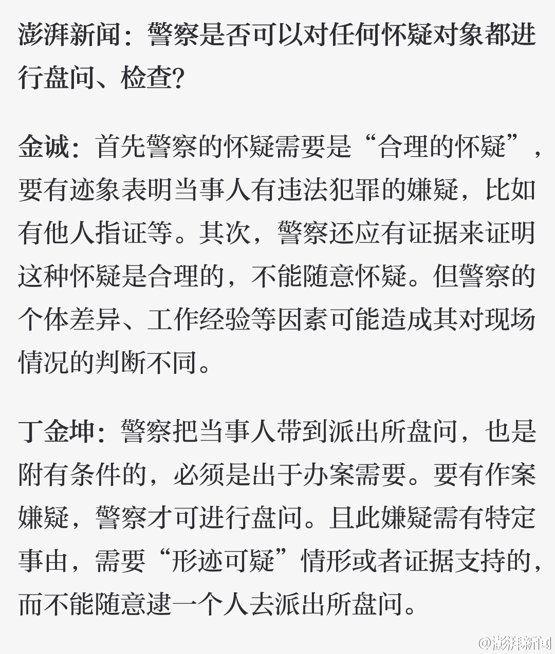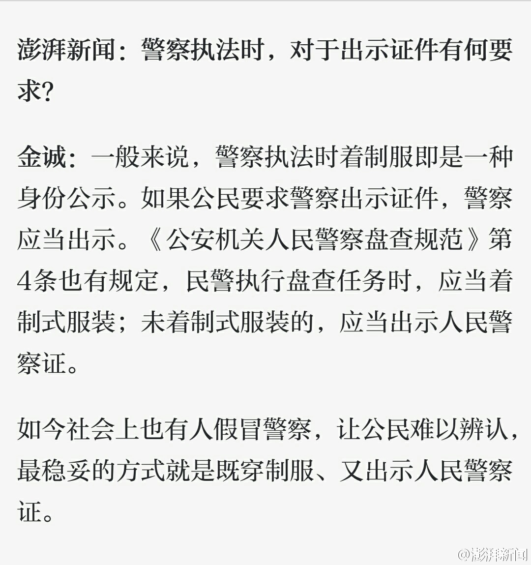 【警察何时可以要求路人出示身份证并带到派出所盘问?】警察何时可以要求路人出示身份证?盘查活动需要哪些程序?警察在执法过程中如何保障公民权利?澎湃新闻就此采访了清华大学法学院教授张建伟、浙江警察学院教授金诚及上海大邦律所丁金坤律师。