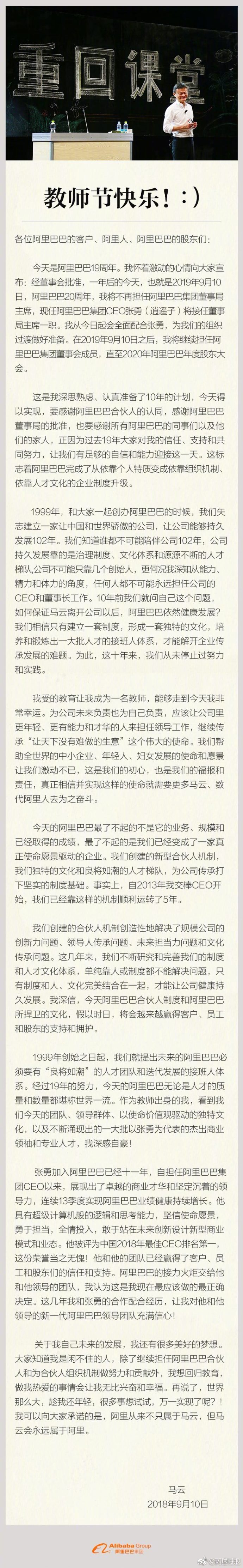 消息,马云宣布明年今日将不再担任董事局主席,CEO将由张勇接任,阿里巴巴的接力火炬交给张勇和他领导的团队。