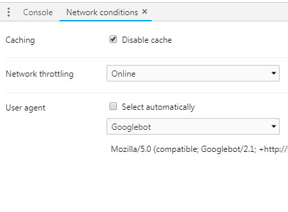 所以,只要把浏览器的 User Agent 改为搜索引擎的爬虫即可访问其内容。对 Chrome 来说就是按 F12,点下面那三个点,在菜单中选 Network conditions,然后将 User Agent 设置为 Googlebot 即可。