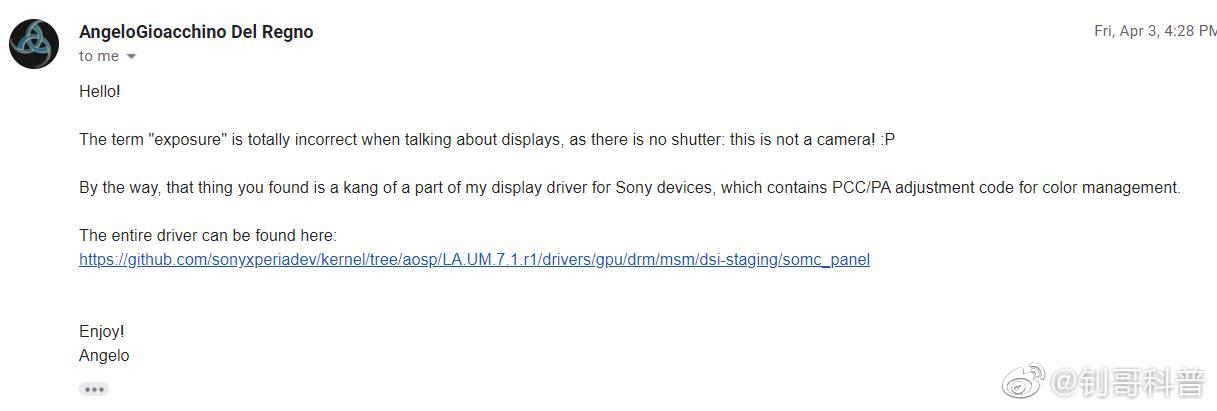 我把Angelo的回信用中式土话翻译一下:说到屏幕的时候说exposure就是扯犊子,屏幕又不是相机。你找到那玩意儿是我之前给索尼系的一个驱动的一个山寨版,全套代码在这里。
