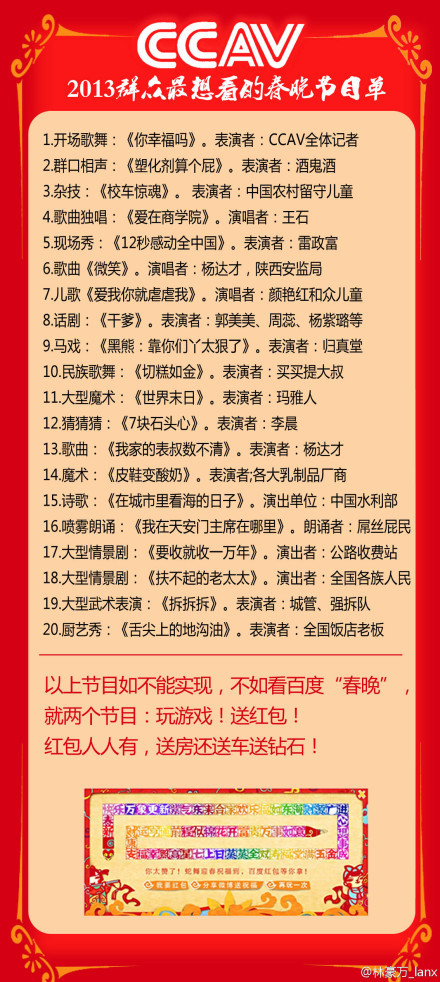 2013群众最想看的春晚节目单出炉!笑喷了!砍掉了开场群魔舞,皮笑肉不笑相声,主持人白水段子,全球贺电轱辘话,亲 ,春晚节目组能答应嘛?!除夕无聊的蛋疼,不如看百度“春晚”,两个经典节目:玩游戏!送红包!今晚12点 www.baidu.com 红包人人有,送房送车送钻石 !