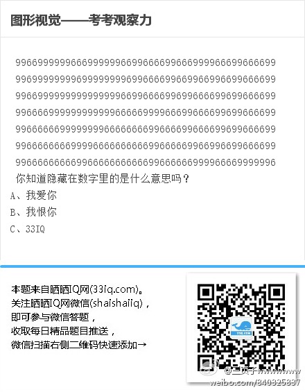 答案:A。将所有的⑨涂上颜色可以看到I❤YOU
