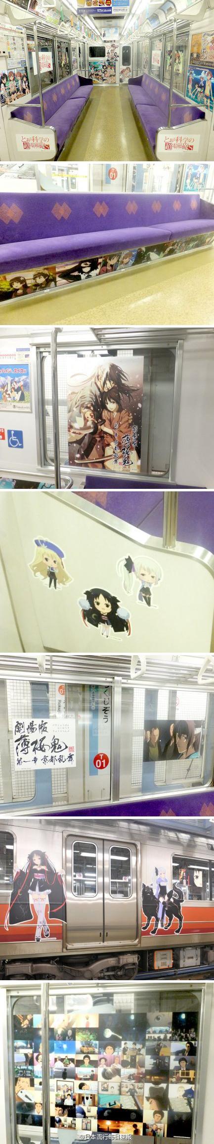 【京都痛电车】京都市営地下鉄推出动漫电车“京まふ号”。车厢内部装饰有个多部人气动漫卡通人物,车厢外另有等身大动漫人物 贴纸。展出作品包括《宇宙兄弟》,《薄桜鬼》,《とある科学の超電磁砲(レールガン)》,《機巧少女》等。7月25日开始运行,运行期2个月…