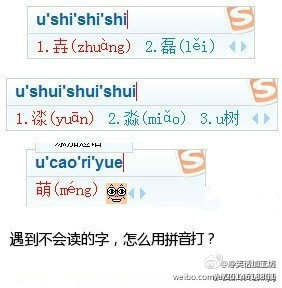 遇到不会读的字,怎么用拼音打?可以先打个“u”然后打各个部首的读音,就能出来哦,如图所示!「转」