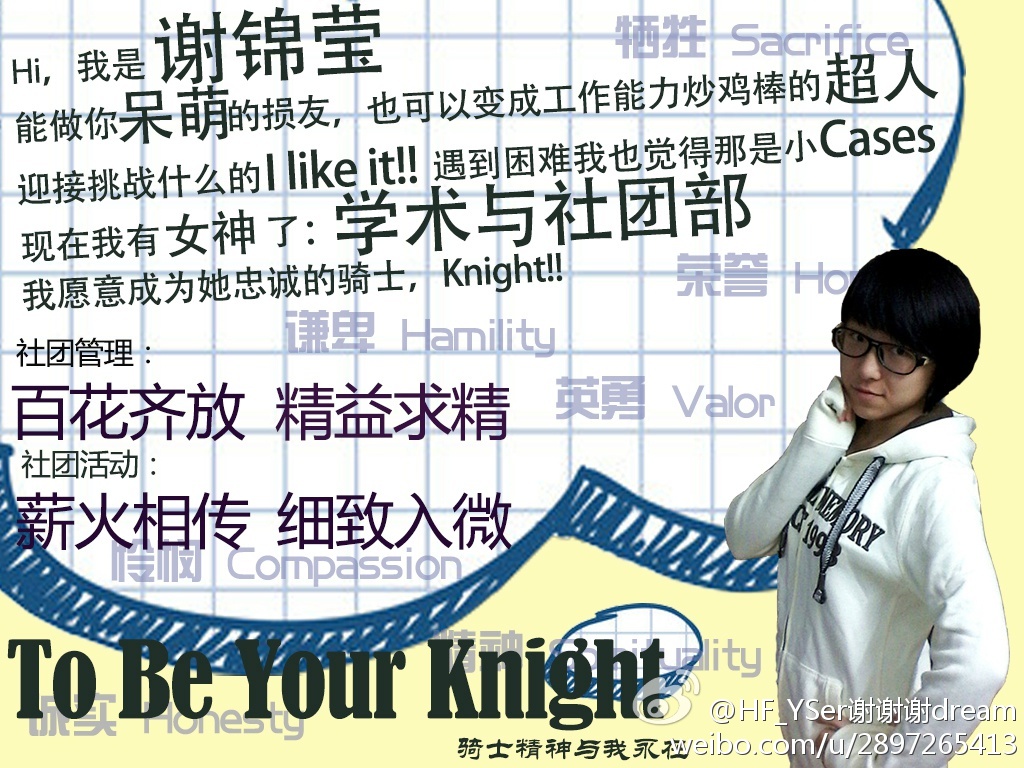 开朗、善谈,是她与人相处的表现;稳重、负责,是她对待工作的态度。明白持之以恒的守护不易,她还是坚定地选择追求——“学术与社团部,我愿做你的骑士。To be your knight!”她是谢锦莹