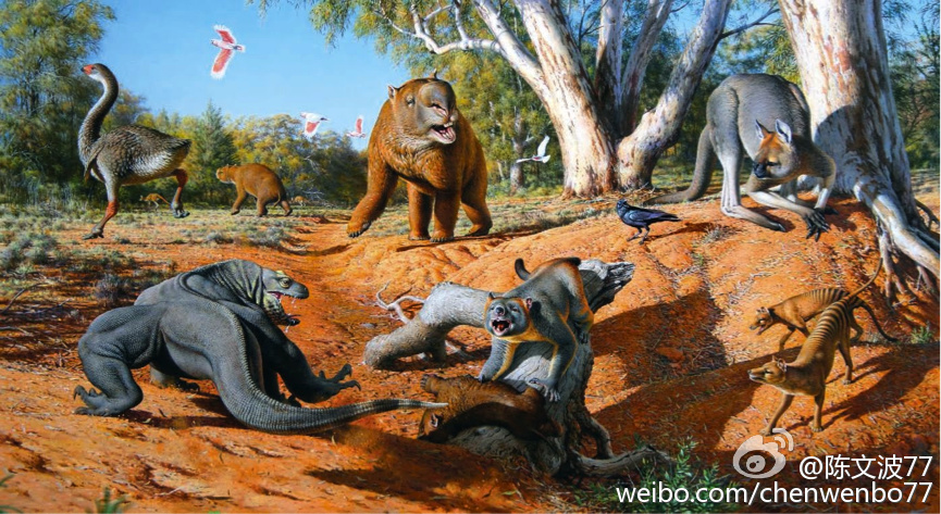 不久前的澳洲还是这样的:凶猛的袋狮、7米的巨蜥、近3吨的袋熊。。。然并卵,45000年前,所有这些巨兽纷纷踏上了灭绝之路,只因人类踏上了这块土地。如今的澳洲动物只是残存下来的小可怜们,除了人类它们还面临喵星人、狐狸等后来物种的威胁。什么古人、土著人、传统文化跟自然和谐相处,都是bullshit!