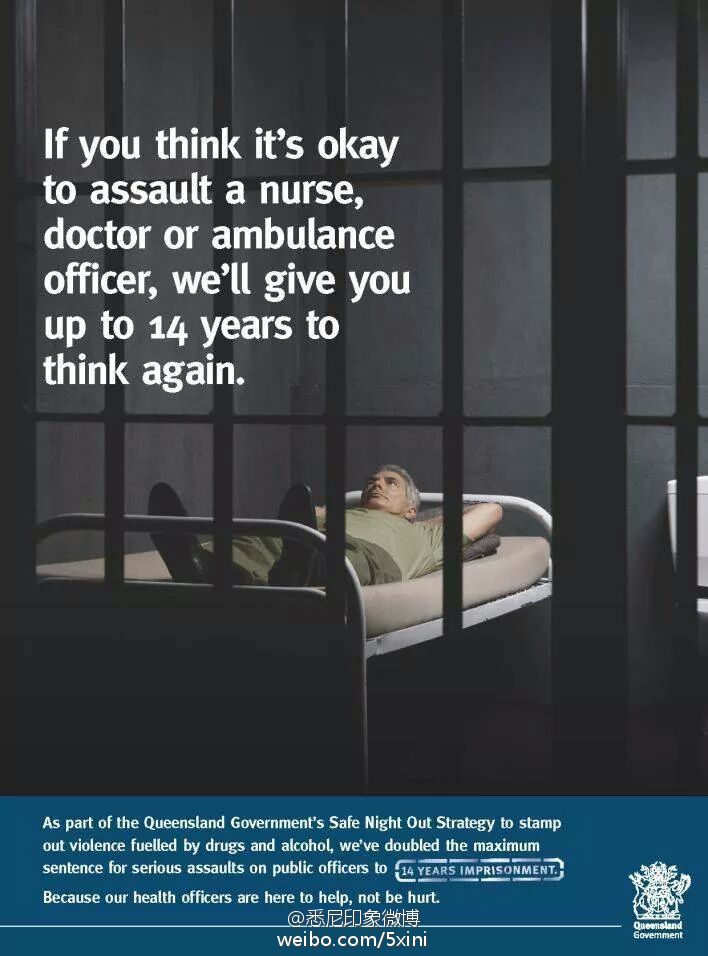 【印象分享】澳大利亚医管局的宣传海报:“如果你认为攻击医生或护士是正确的,那我们将给你14年的时间(在监狱里)去重新思考一下这个问题”。这张海报值得中国相关部门借鉴下~~