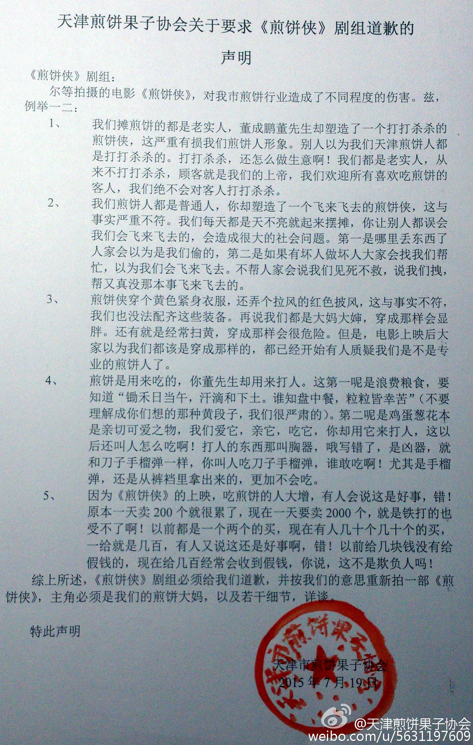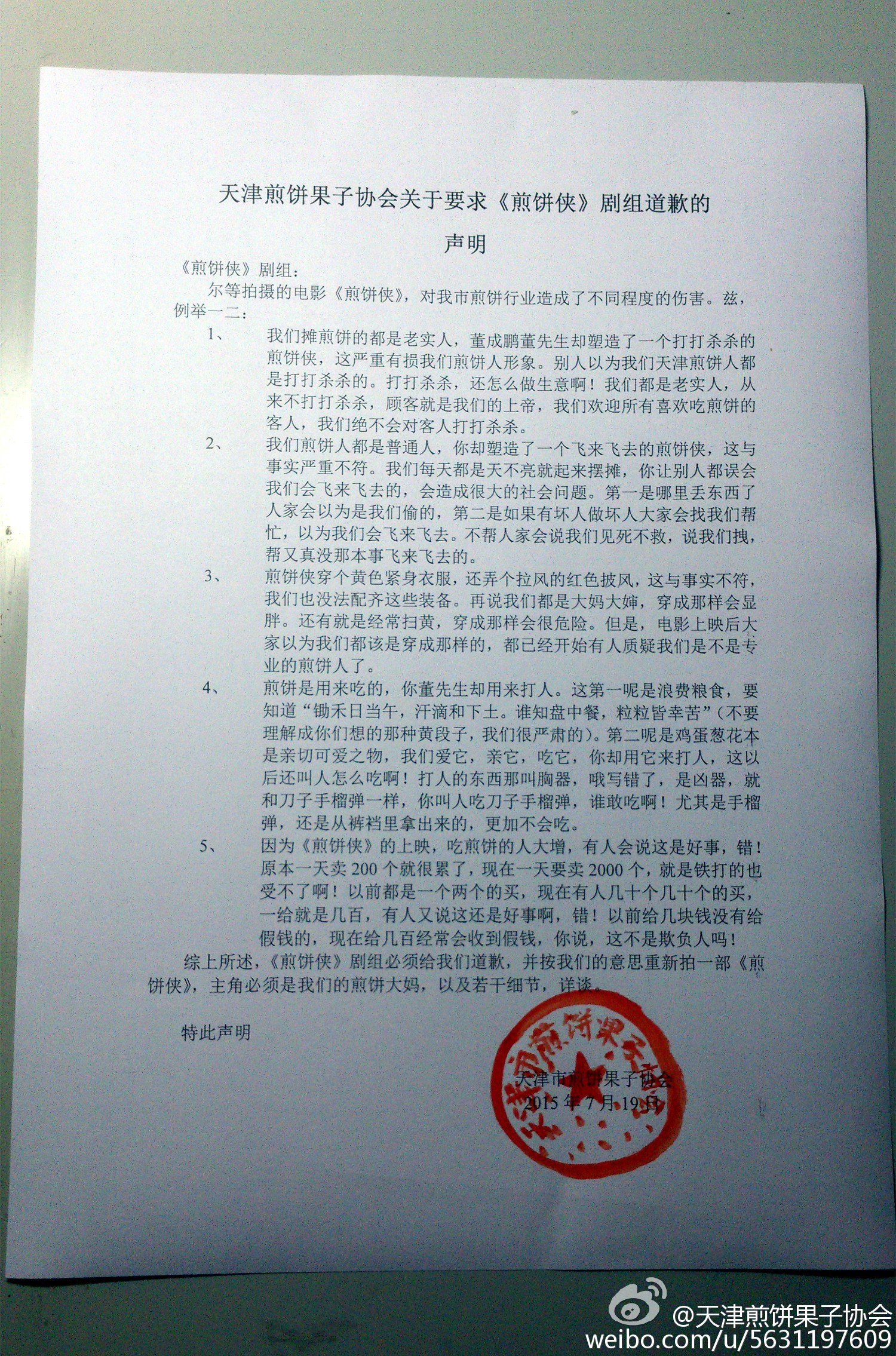 分享图片我发表了文章《天津市煎饼果子协会要求<煎饼侠>剧组道歉的声明》