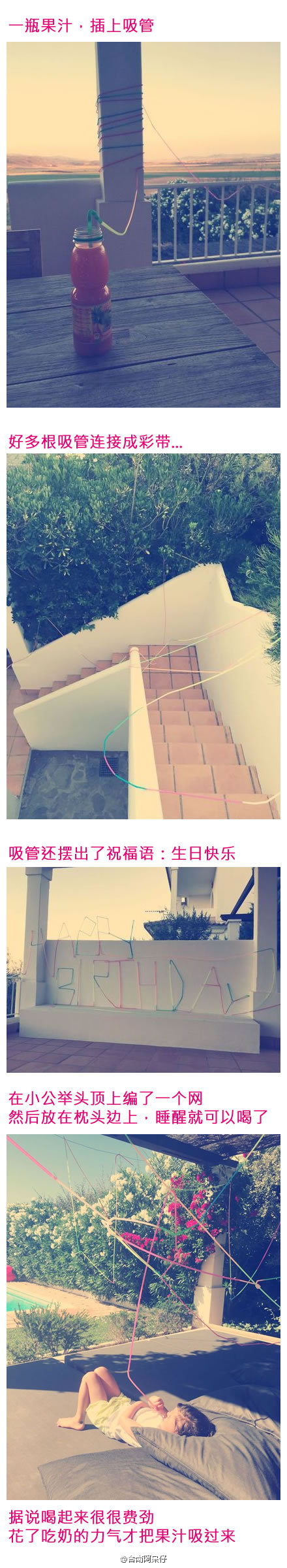 国外有位爸爸给女儿准备了一份与众不同的生日礼物:在家里将很多根吸管连接成彩带,一头放在女儿的枕头边,穿越整个家,中间还排成生日祝福语,另一头终点是一瓶美味的果汁。小公举醒来后就喝到果汁,不过花了不少力气,真正度过了一个难忘的生日,惊喜万分。