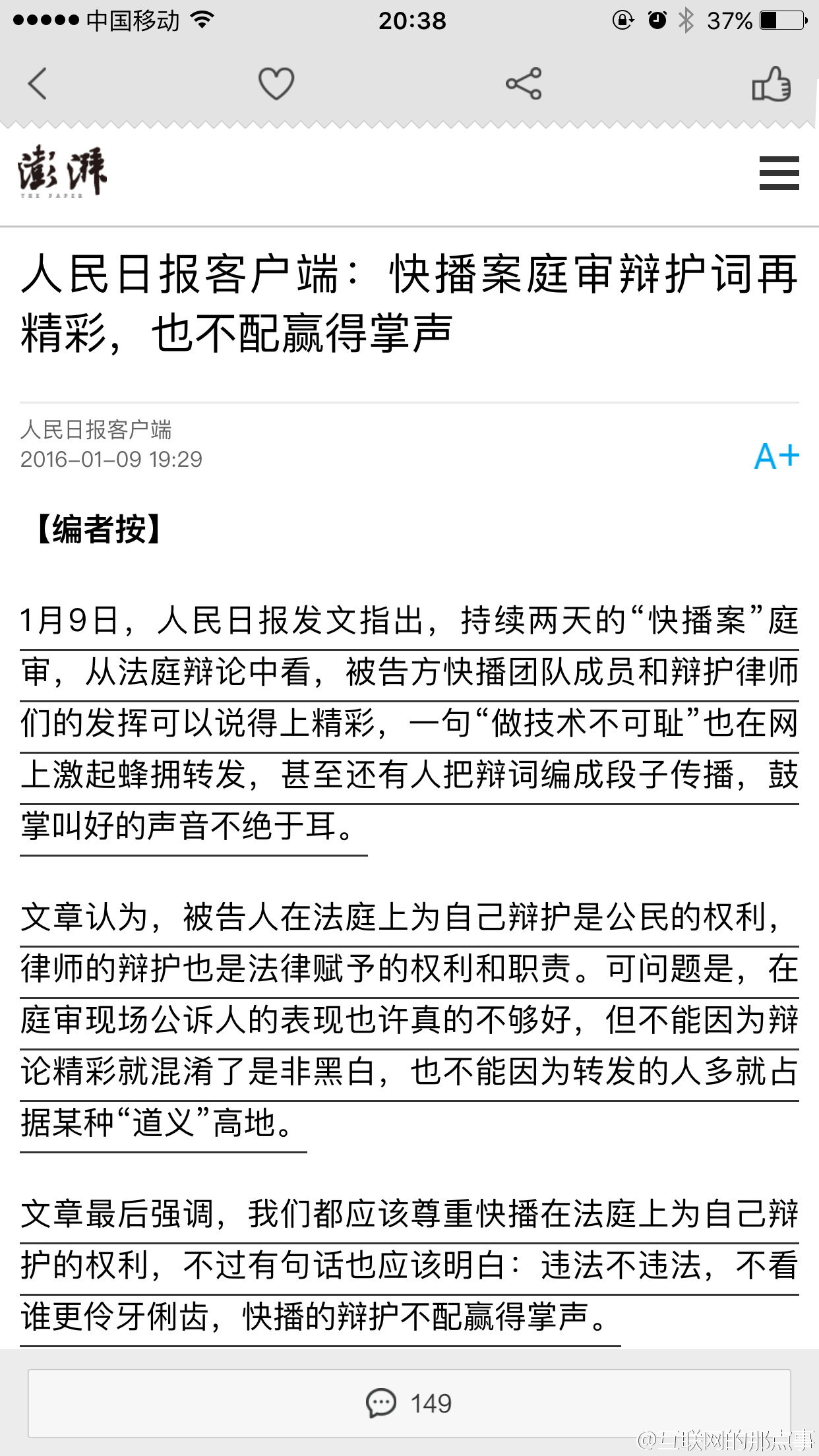 【人民日报:快播案庭审辩护词再精彩,也不配赢得掌声】持续两天的“快播案”庭审,法庭辩论可以说得上精彩,鼓掌叫好的声音不绝于耳。但不能因为辩论精彩就混淆了是非黑白,也不能因为转发的人多就占据某种“道义”高地。违法不违法,不看谁更伶牙俐齿,快播的辩护不配赢得掌声。