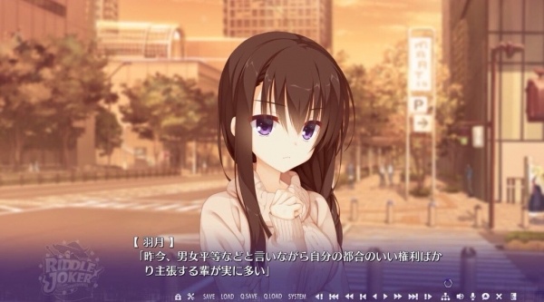 柚子社的新作游戏《RIDDLE JOKER》中的角色台词「最近说男女平等什么的人,实际上很多都是为了方便自己主张自己的权力,如果是以男女平等为目标的话,就必须应该有也要背负至今为止男性所承担的艰辛痛苦的觉悟。已经有了女性特有的福利还要享有男性的福利,我不想成为这么浅薄的人」。永远喜欢柚子社