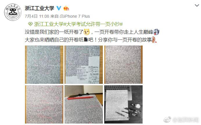 的微博:【浙江一高校推行“一页开卷”考试,校方:考察厚书读薄的能力】期末考试季,@浙江工业大学 的“一页开卷”爆红!一位参加今年考试的学生在接受澎湃采访时表示,学校规定带入考场的资料仅限于一页A4纸、不能复印、不能粘帖,为尽可能多地“记下”知识点,他共在纸上抄写了上万字。据悉,该校推行“一页开卷”的考试方式已经15年了。命题老师表示,由于只能写一张纸,所以学生需要自己去归纳概括教材,“这就是一个从厚到薄的转变。要让学生把书读薄,好好研究教材。这是重点,也是难点。”网友:“这不就是曲线逼背书嘛......”https://www.thepaper.cn/newsDetail_forward_2244424 [组图共4张]