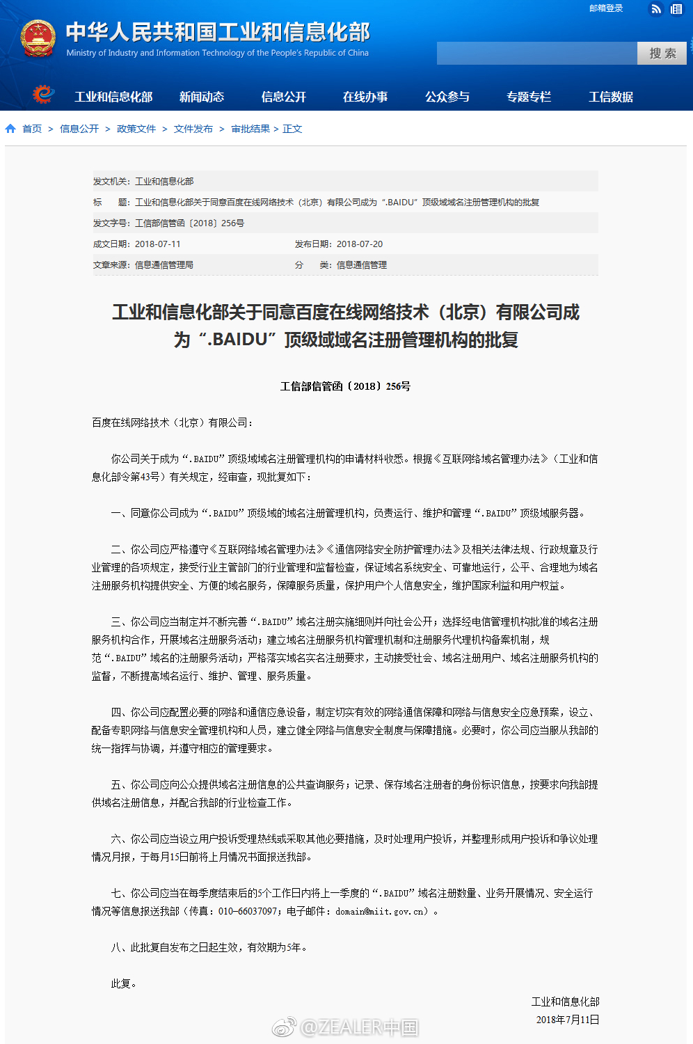 【工信部:同意百度公司成为“.BAIDU”顶级域域名注册管理机构】工信部今日发文称,同意百度在线网络技术(北京)有限公司成为“.BAIDU”顶级域域名注册管理机构,负责运行、维护和管理“.BAIDU”顶级域服务器。不知道 www.google.baidu 这个网址会不会被抢注?