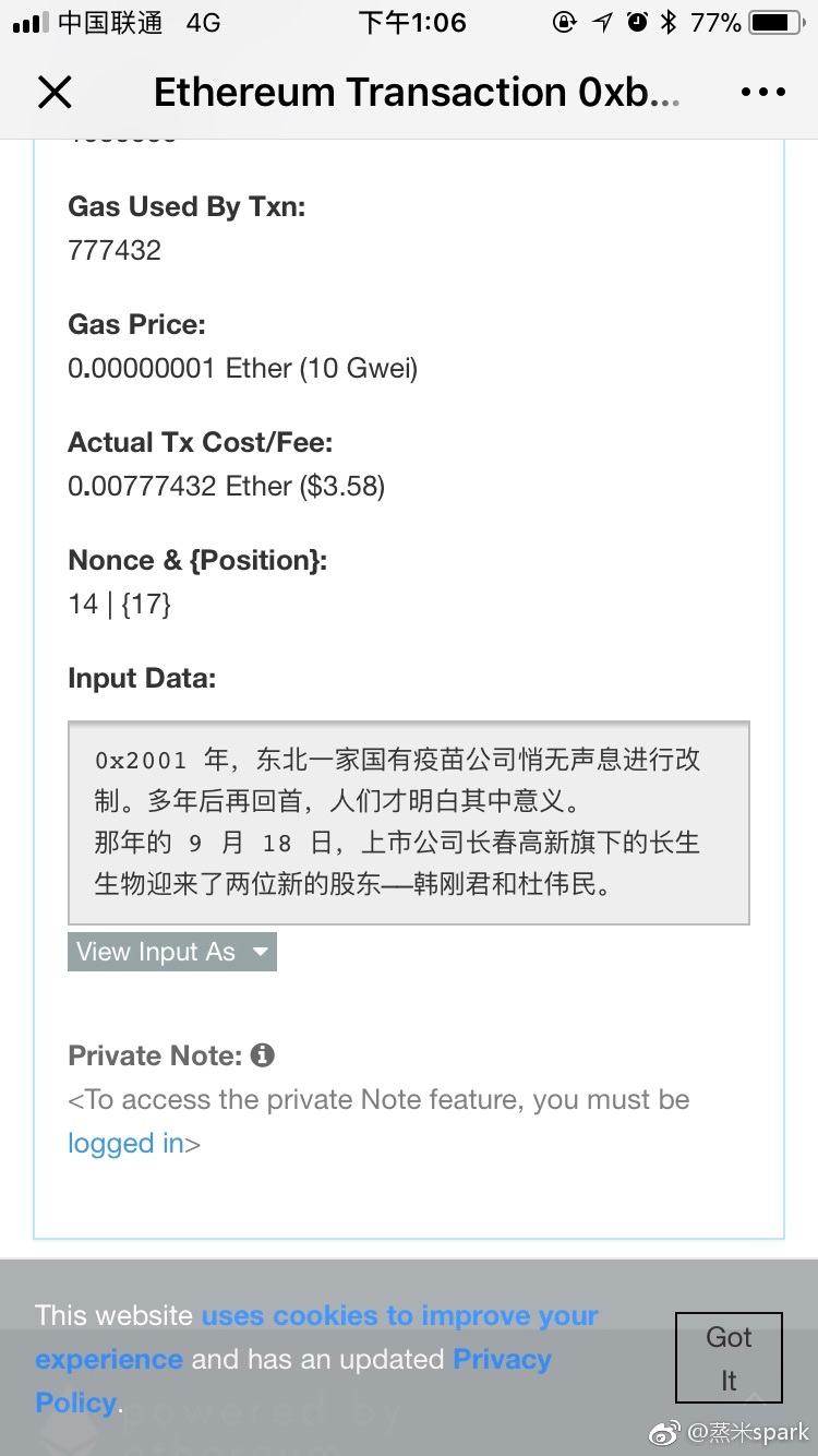 用户1340774522  转发了 @蒸米sparkV 的微博:view input as utf-8: https://etherscan.io/tx/0xb1ed364e4333aae1da4a901d5231244ba6a35f9421d4607f7cb90d60bf45578a 这才是区块链正确的使用方式。。。[嘘] #疫苗#