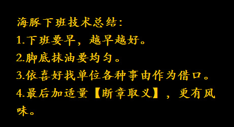 首先我们用点时间打开各种社交工具,然后用适量宽油抹在脚上,最后依照喜好复制【下班了】后疾呼断章取义。