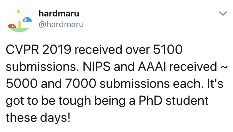 CVPR 2019收到超过5100份论文,NIPS和AAAI收到~5000和~7000份论文。对博士生而言,真是“时势艰难”啊~ via:hardmaru
