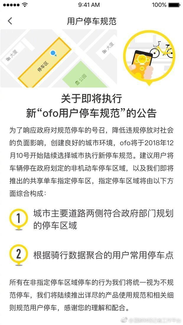 用户1340774522  转发了 @蓝鲸财经记者工作平台VM 的微博:ofo小黄车:将从2018年12月10日起公布并在全国范围逐步推行新版《ofo共享单车用户停车规范》。《规范》内容分为指定停车区和禁停区两部分,旨在通过奖惩结合的举措,引导用户规范停车,营造良好的城市出行环境。
