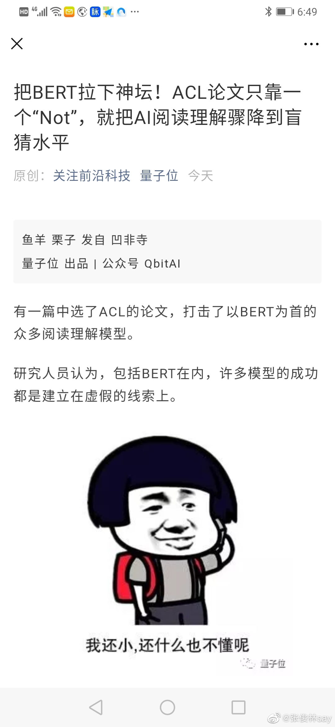 Bert已经在十几个不同的NLP子领域,几十个数据集合上证明了有效性了,难道这么多领域的数据集合都有严重问题?如果真这样,那说明最近10几年NLP的任何大的技术进展都是虚假的,能证明这点,那才是能上天的大新闻呢。这就像什么呢,打个比方:就像我们打造了一把新武器“ 屠龙宝刀”,用它已经杀了几十头龙,突然有一天有个人说:这些龙里,有头龙其实是猪装扮成的,不是真龙,所以结论是屠龙宝刀是假的。这种推理中的逻辑错误不是显而易见吗?