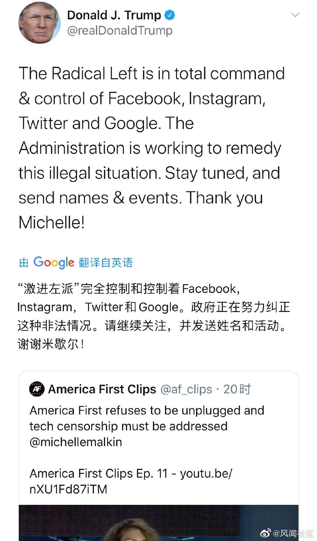 特朗普发推特说,“激进左派”控制了Facebook、Instagram、Twitter和Google