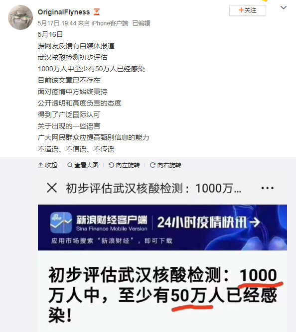 :据网友反馈,有自媒体报道,根据财新网的报道,武汉核酸检测中 1000 万人中至少有 50 万人已经感染