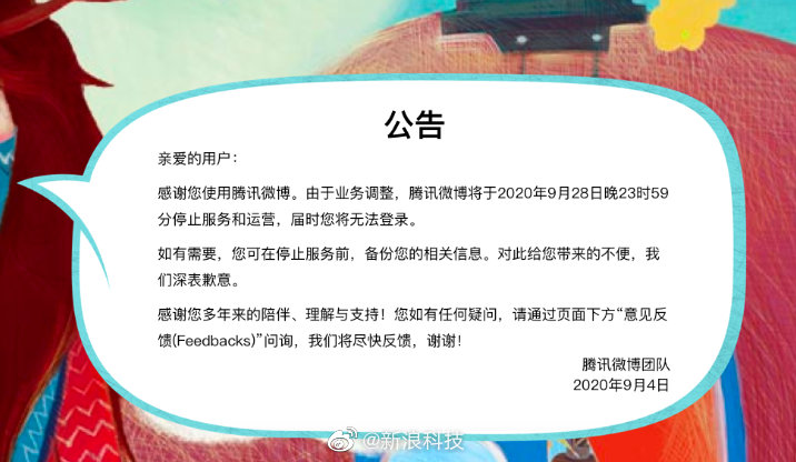 】腾讯微博9月4日发布官方公告称,将于2020年9月29日23时59分停止服务和运营,届时将无法登录。