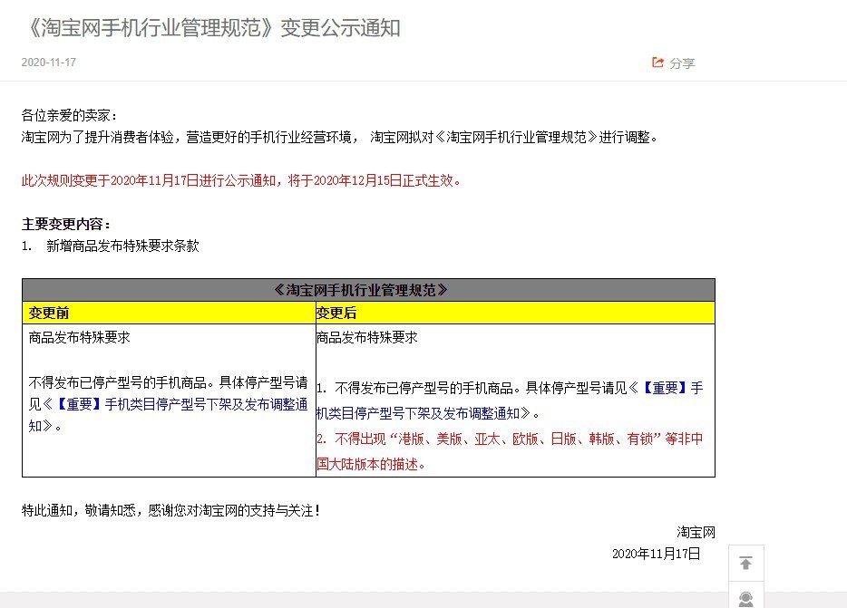 :淘宝网修改了《淘宝网手机行业管理规范》,禁止销售非国行版本、已停产型号的手机,12 月 15 日 生效。