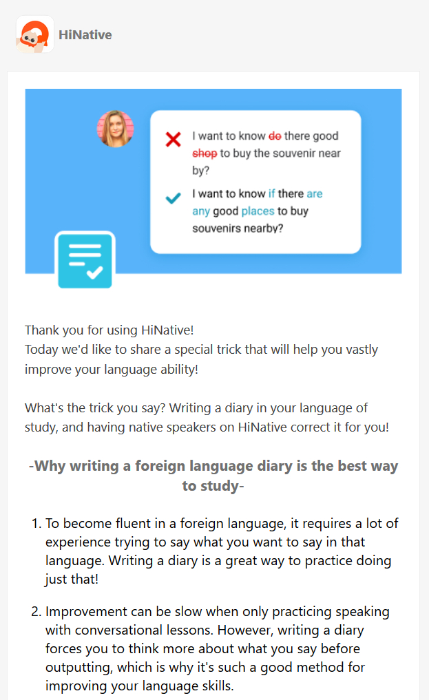 :HiNative 的功能推广邮件。看到第一眼就感觉这是家日本公司,一查果然是。日本人说英语就是这股味道。