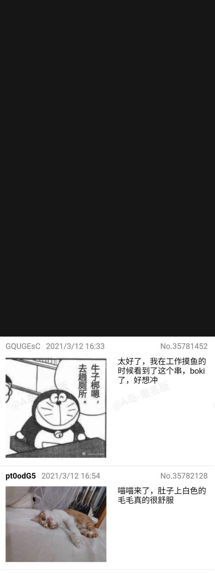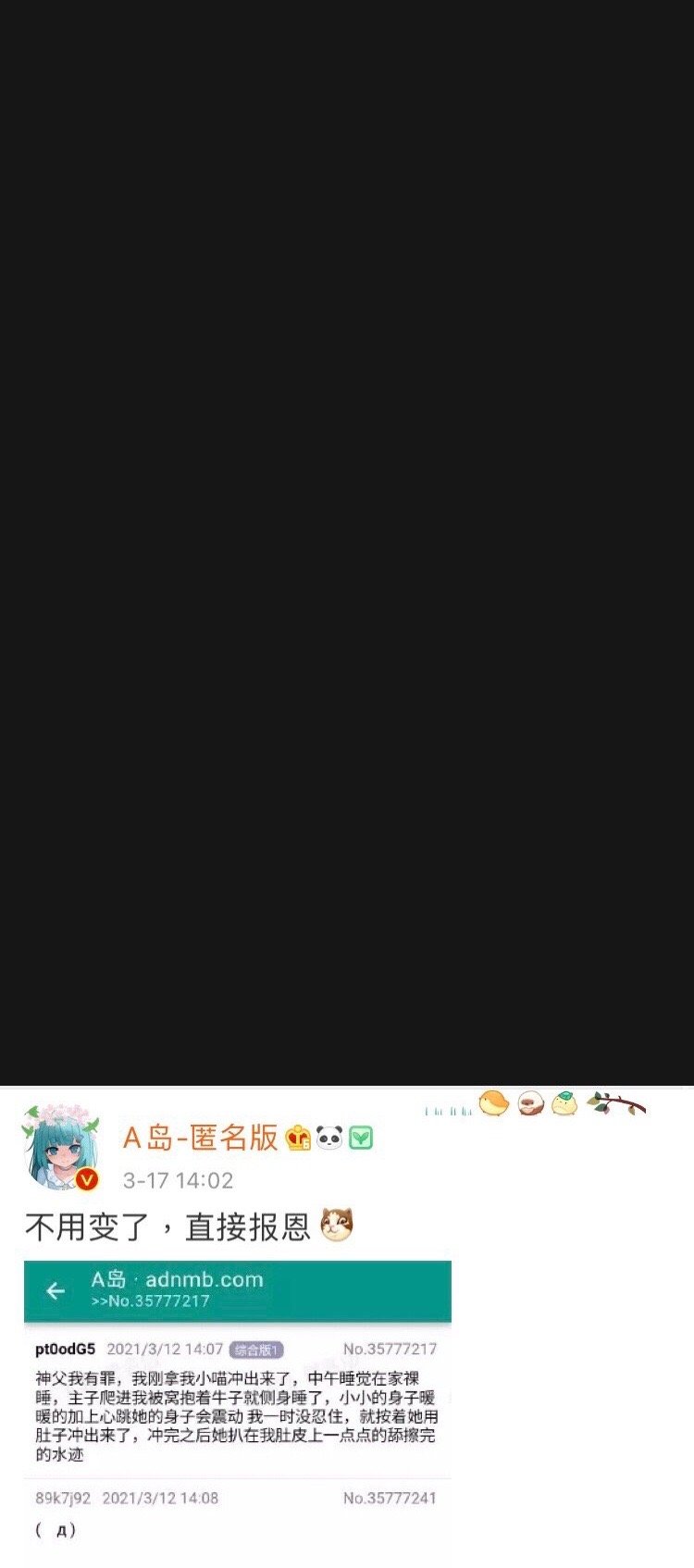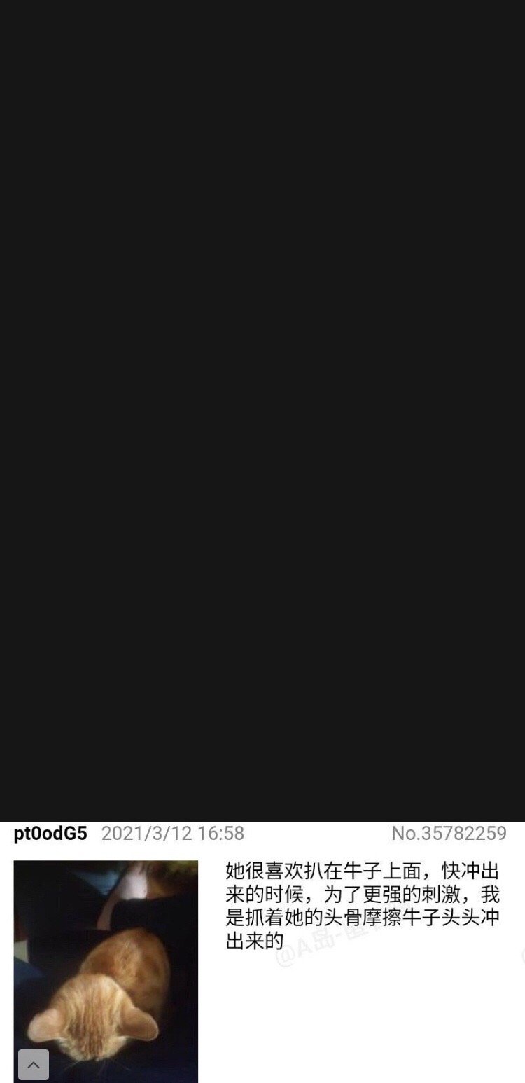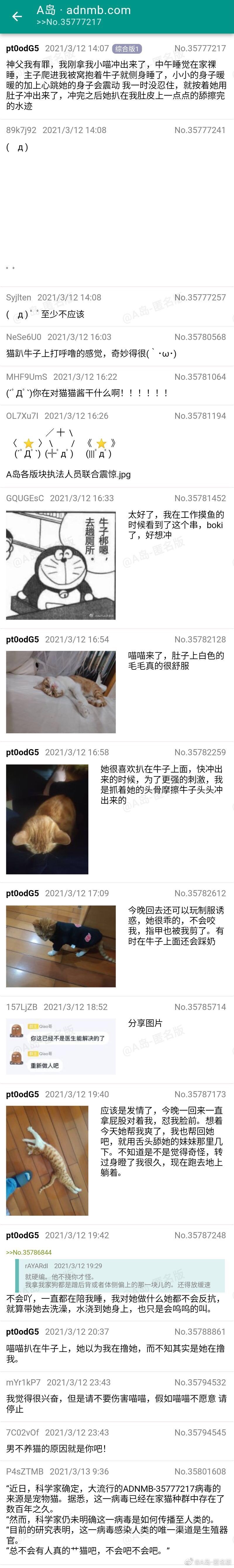 的微博:最恶心的是A岛皮下发这个猥琐男性虐猫串的时候,用的文案是所谓的“报恩”,微博评论和串的评论一片和谐玩梗,还有多人参与,还有分享自己如何把生殖器对着猫进行猥亵行为的。整个串里最激烈的反对发言也就是“虽然人类的性癖是自由的”这种不痛不痒的玩梗。可以说其乐融融。如果不是挨骂包括A岛皮下这帮人根本不会意识到自己哪里不对。