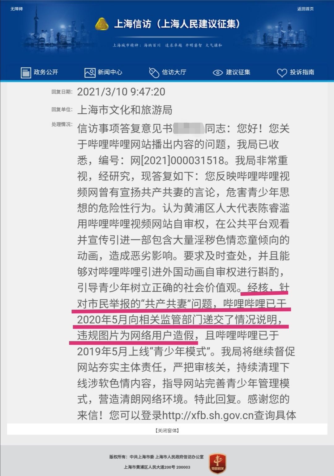上海市文化和旅游局:哔哩哔哩“共产共妻”违规图片为网络用户造假