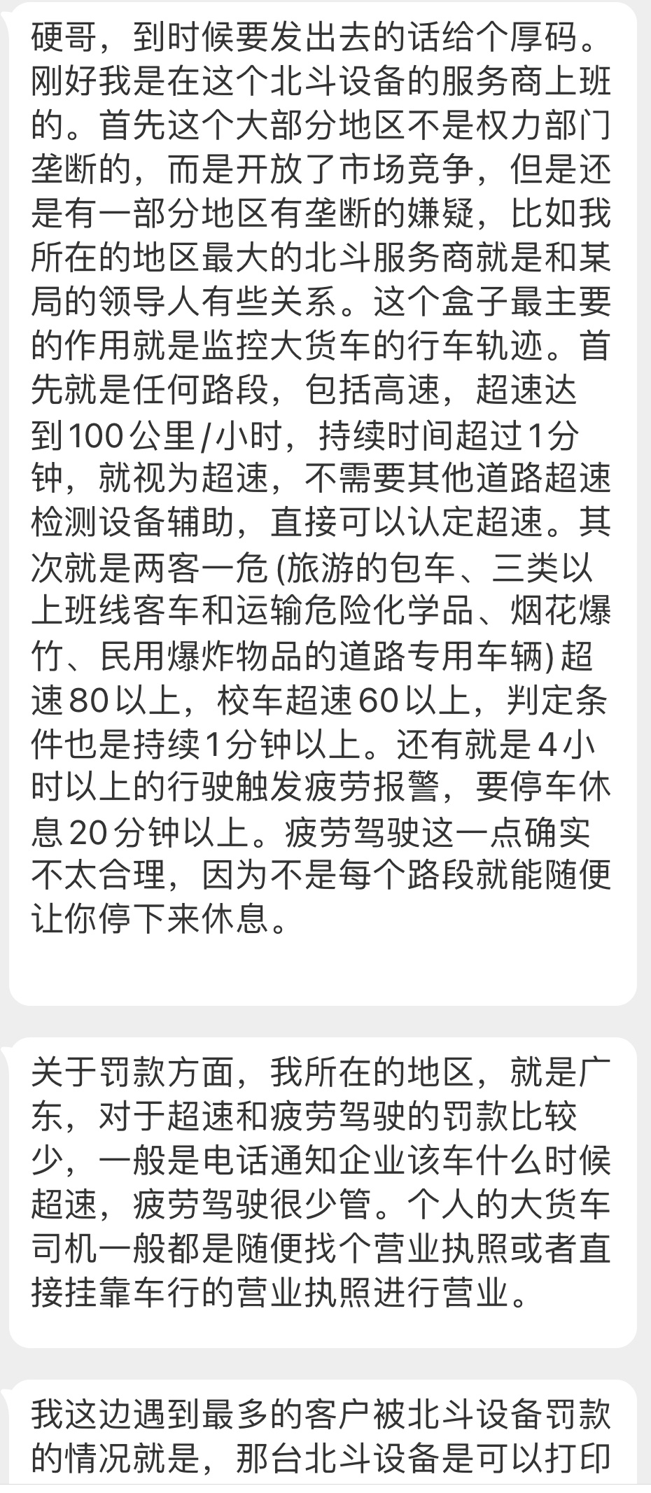 刚我转的那条北斗新闻,有粉丝在北斗设备服务商工作,给我科普了一下:北斗盒子的功能、处罚机制、资费和服务费、司机的破解与反破解、今后的升级方向、为啥不太靠谱。