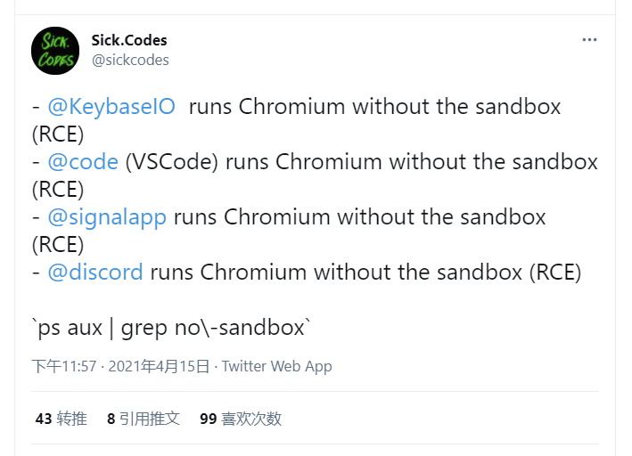 (除了推文中提到的 Electron,QtWebEngine 也是以无沙盒模式开启 Chromium 内核的。)